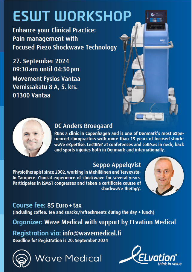 Shockwave-terapiaa potilastyössä jo hyödyntäville sekä ESWT:stä hoitomuotona kiinnostuneille terveysalan ammattilaisille.